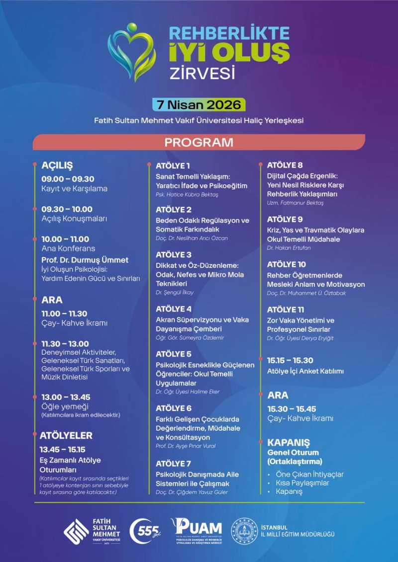 İstanbul İl Millî Eğitim Müdürlüğü (MEB) ile Fatih Sultan Mehmet Vakıf Üniversitesi Psikolojik Danışma ve Rehberlik Uygulama ve Araştırma Merkezi (PUAM) iş birliğinde düzenlenen Rehberlikte İyi Oluş Zirvesi 2026, 7 Nisan 2026 tarihinde FSMVÜ Haliç Yerleşkesi’nde gerçekleştirilecektir.